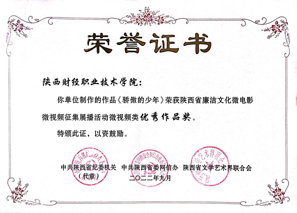 近日,省纪委办公厅、省委网信办、省文联联合下发了《关于表彰陕西省廉洁文化微电影微视频征集获奖作品的通报》(陕纪办〔2022〕35号文件),我校纪委综合室创作拍摄的微视频《骄傲的少年》荣获廉洁文化微视频“优秀作品奖”,全省仅9所高校获此荣誉。