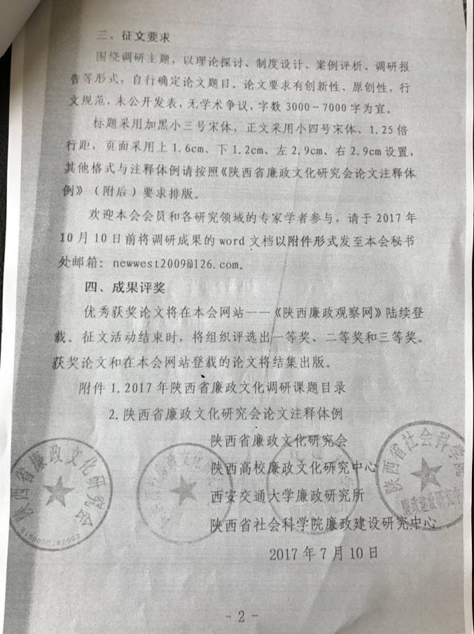 现将陕西省廉政文化研究会、陕西高校廉政文化研究中心、西安交通大学廉政研究所、陕西省社会科学院廉政建设研究中心印发的《关于2017年廉政文化课题调研及征文通知》转发你们。请大家按照征文主题及要求积极撰稿,于2017年9月30日前将稿件电子版(word文档)发送至纪检监察审计处。